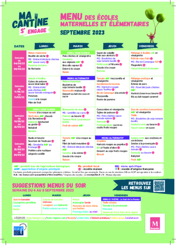 Découvrez le détail des menus prévus dans les assiettes des petits Montpelliérains en ce mois de rentrée, des suggestions de menus du soir, le panier du mois ou encore des actualités sur l'alimentation durable pour aller plus loin.