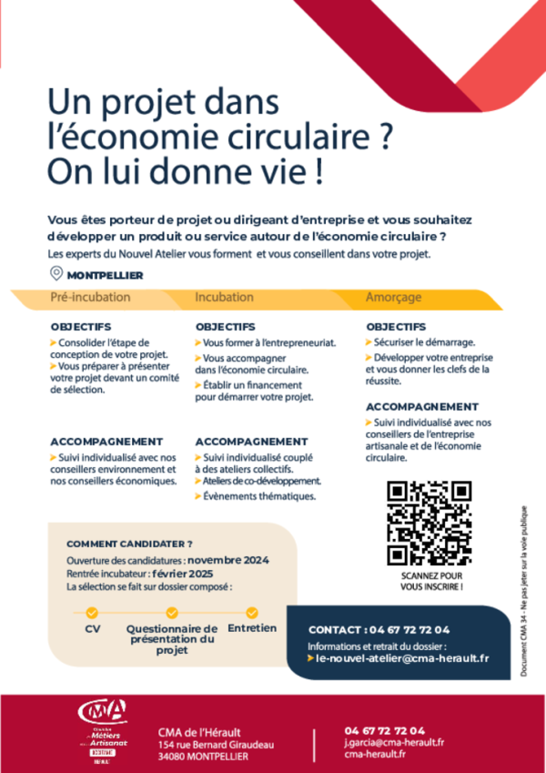 " Nous avons le plaisir de vous annoncer que "Le Nouvel Atelier", notre incubateur à destination de projets artisanaux de l'économie circulaire, va enfin pouvoir voir le jour à Montpellier début 2025 grâce au partenariat noué avec la Métropole de Montpellier et le soutien de la Région et de l'ADEME. L’accompagnement sera réalisé par des experts de la création d’entreprise, de l’économie circulaire et de la transition écologique, à l’aide d’ateliers collectifs mais aussi de rendez-vous individuels adaptés aux besoins des porteurs de projet sur des thématiques clés : modèle économique circulaire, prévisionnel financier, étude de marché, réglementation environnementale, impact social, financement et communication responsable…", indique la Chambre de Métiers et de l’Artisanat de l’Hérault.