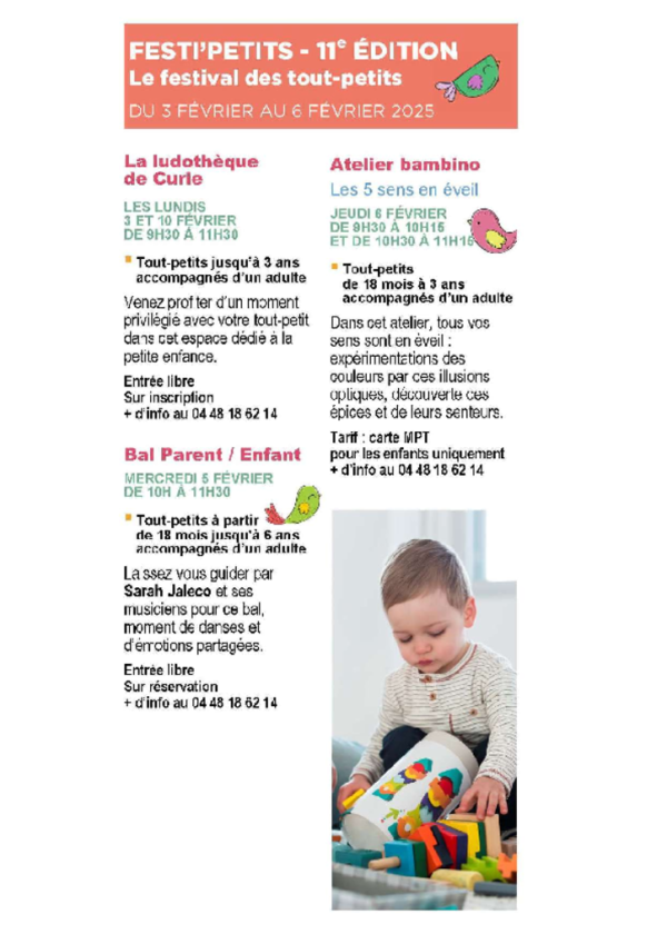 • Tout le mois de février → Au fil de l’année, la Maison pour tous Marie Curie offre des animations pour les petits et les enfants. La ludothèque est ouverte aux tout-petits chaque lundi matin de 9h30 à 11h30. Un atelier mensuel « Bambino » a lieu le jeudi pour les 18 mois-3 ans et des rencontres artistiques sont programmées par mois, notamment des visites en famille et deux ateliers pour les 3-6 ans et les 7-10 ans.