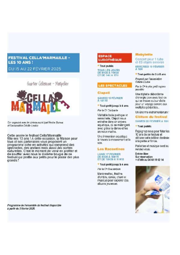 En février, les enfants sont invités à Marie Curie pour les deux temps forts que sont Festi’Petit, ✅ Entrée libre ✅ le festival porté par le réseau des médiathèques, ainsi que le festival Cella Marmaille organisé avec le cinéma municipal Nestor Burma et l’association Odette Louise. Téléchargement des deux programmes ci-dessous.