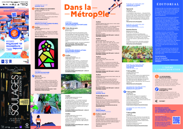 Cette année, les Journées Européennes du Patrimoine des samedi 20 et dimanche 21 septembre est dédiée au patrimoine architectural. Pour l’occasion, deux fils rouges sont proposés pour découvrir et redécouvrir les richesses de notre territoire. Le patrimoine architectural, tout d’abord. En effet, Montpellier et sa Métropole offrent un véritable écrin architectural, héritage pluriséculaire qui s'exprime à travers ses maisons médiévales, ses hôtels particuliers classiques, ses audaces contemporaines. Une diversité qui illustre la vitalité et la créativité du territoire engagé dans la préservation et la valorisation de ses patrimoines pour les générations futures. Cette édition est également marquée par la commémoration des vingt ans de la disparition de Max Rouquette, dont l'œuvre invite à contempler la beauté des paysages de notre territoire.