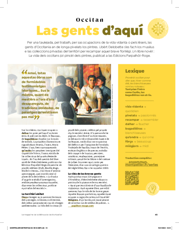 En quelque 226 pages et 270 tableaux, Hubert Delobette affirme sa passion de la peinture et de son territoire. « Je suis moi-même issu d’une famille de vignerons. Je voulais avec ce livre m’attacher à mettre en lumière la vie des petites gens. Ces femmes qui tricotent, ces hommes occupés à charger du charbon sur le Canal du Midi. Et qui n’auraient jamais pensé se retrouver sur des tableaux de maître… ».